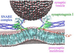 接著,當神經收到訊號、鈣離子(Ca²⁺) 大量湧入時,情況立刻改變。鈣離子會黏上 Synaptotagmin 環,讓這個對稱結構崩解,原本穩固的「鎖」被打開。SNARE 蛋白這時就能「拉鍊式」地快速摺疊,把囊泡猛地拉向細胞膜——砰!囊泡瞬間與膜融合,神經傳導物質像被「釋放軟木塞」一樣爆射出去,完成訊息的傳遞。